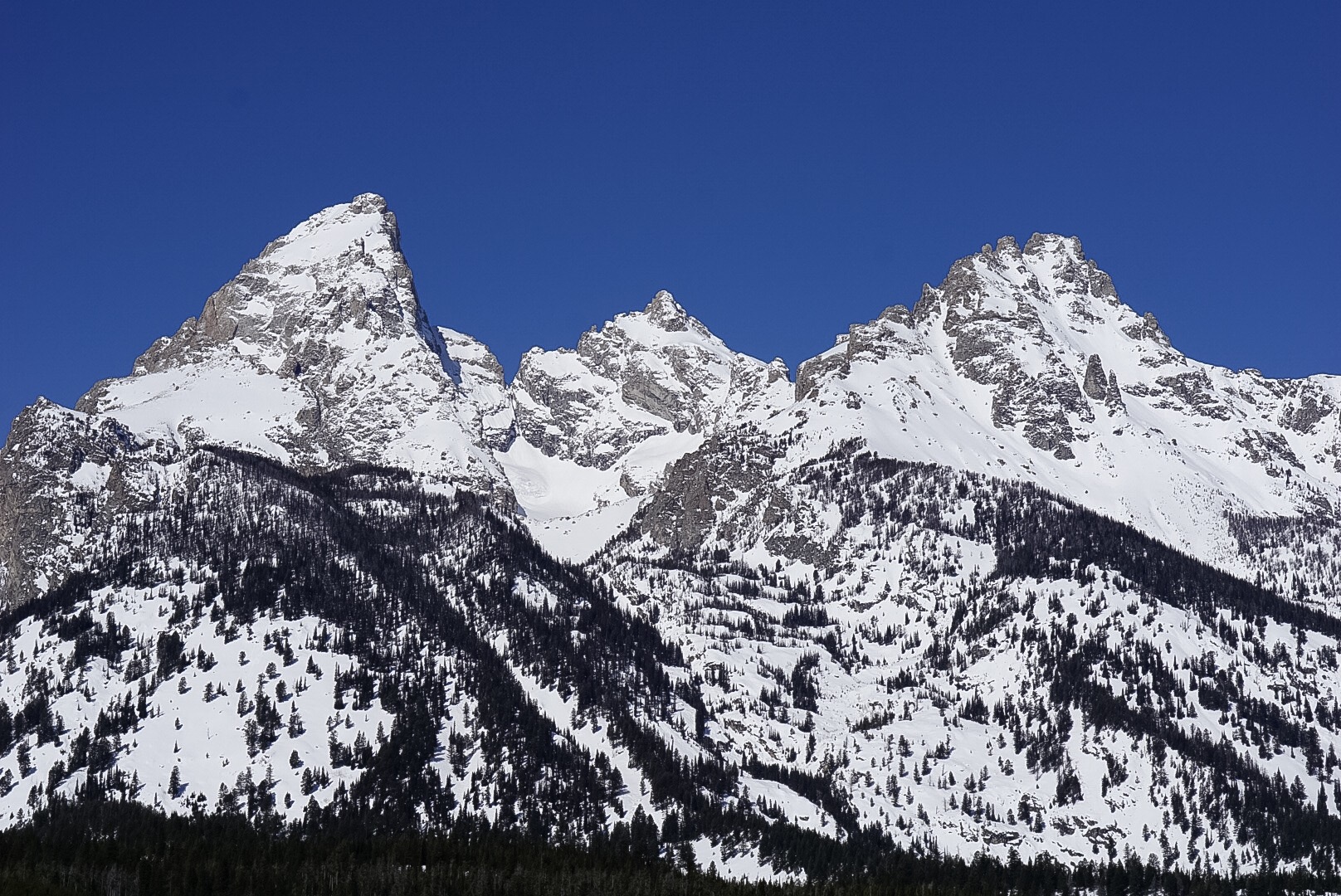 Grand Teton, Mt. Owen, and Teewinot (left to right). A crystal clear morning.