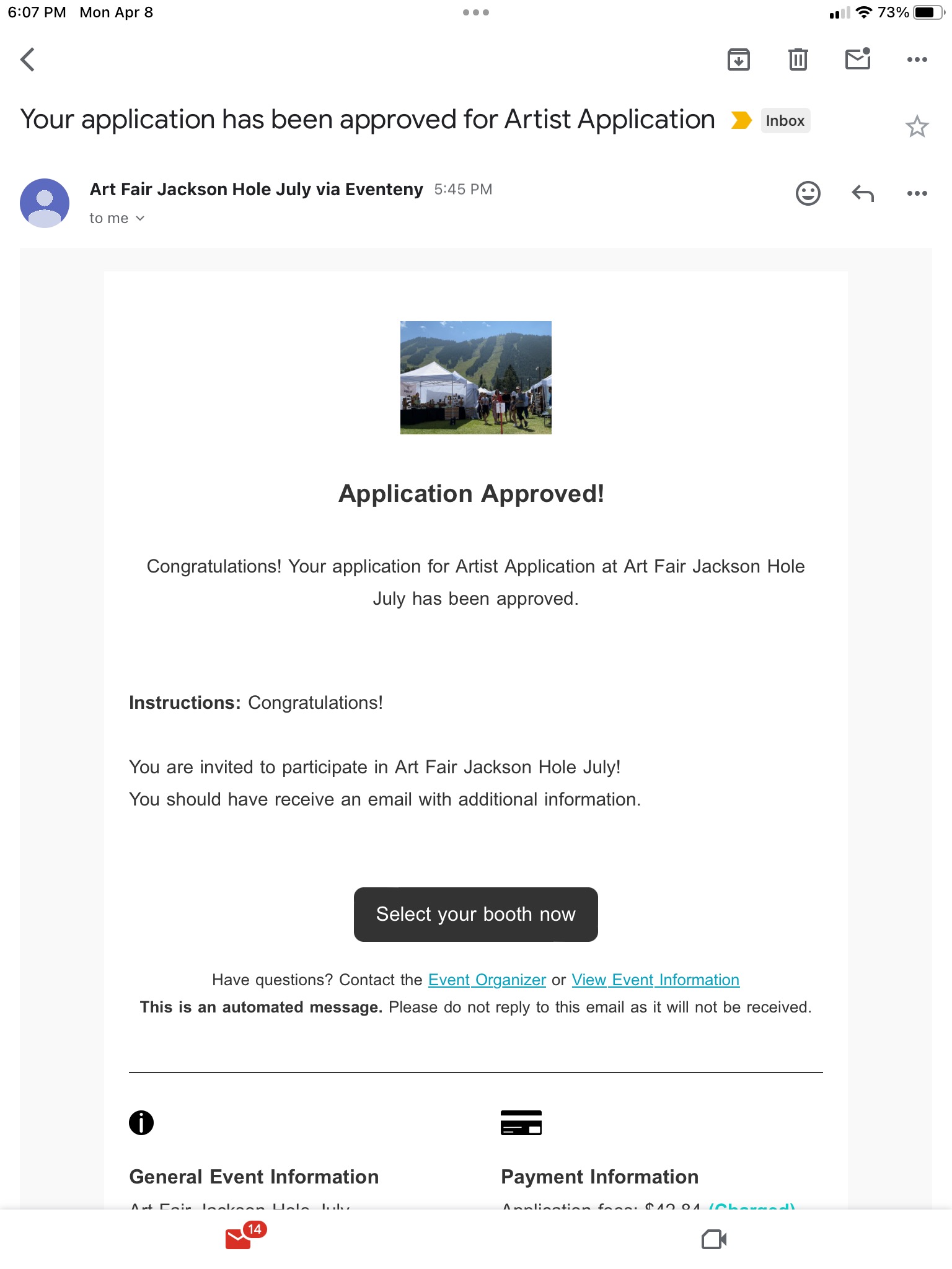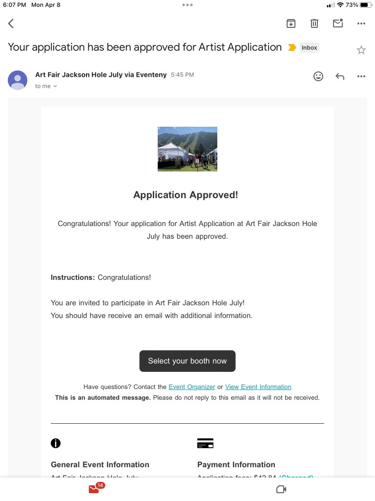 My application to the Art Fair Jackson Hole-July has been accepted. My booth slot is C7. July 26-28, 2024.